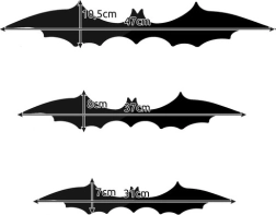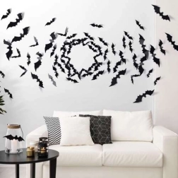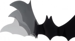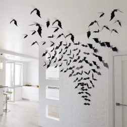 Das Set enthält 3 Fledermäuse mit Spannweiten von 47, 37 und 31 cm, die Ihrem Interieur einen markanten „Wow“-Effekt verleihen. Das glänzende Schwarz und die 3D-Form ermöglichen dramatische Installationen an Wänden, Fenstern oder Türen.