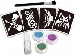 Pinsel, 4 Schablonen (wiederverwendbar), Tattoo-Kleber, Glitzer in 3 Farben, Anleitung