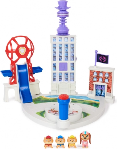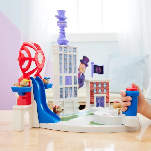 Macht euch bereit, Adventure City mit Liberty und den Junior-Welpen zu retten! Bürgermeister Besserwisser und Vee führen etwas im Schilde – und es liegt an Liberty und den Junior-Welpen, sie aufzuhalten! Dieses Set enthält einen Miniatur-Turm der PAW Patrol sowie verschiedene Ziele am Horizont von Adventure City. Mit eurem treuen Welpenwerfer der Junior-Welpen ist es eure Aufgabe, Vee und den Bürgermeister Besserwisser zu stoppen und die Situation zu retten! Platziert zunächst eines der Junior-Welpen auf der Startrampe. Sobald es bereit ist, zieht es zurück, dreht die Welpen-Katapultbasis nach links oder rechts und zielt auf 3 vorbestimmte Ziele! Drückt den roten Knopf am Griff des Werfers, um eines der Welpen auf das riesige Zylinderhutsymbol am höchsten Gebäude zu schießen – daraufhin erscheint eine riesige Grafik von Bürgermeister Besserwisser. Jetzt schießt das zweite Welpen ab, um ihn aus dem Weg zu räumen! Ist der erste Teil geschafft, ladet das dritte Welpen in den Werfer, zielt auf die Spitze des rechten Gebäudes und versucht, es zu treffen, um die Tür der Gefängniszelle vor dem Gebäude umzuwerfen und Vee zu fangen! Schließt alle drei Teile ab und rettet den Tag! Ein Riesenspaß! Dieses unterhaltsame Spielset enthält außerdem eine gigantische Rutsche mit Rampe vor dem PAW-Patrol-Turm – genau wie im Film – sowie einen Kontrollraum und mehrere Spielbereiche, in denen ihr eure Lieblingsszenen aus PAW Patrol: Der Mighty Kinofilm nachspielen könnt! Mit Spielzeugen aus der Welt der PAW Patrol können Kinder beim Spielen ihre Fantasie und motorischen Fähigkeiten entwickeln und gleichzeitig ihre Lieblingsmomente aus dem Film erleben. Für noch mehr spannende Missionen, inspiriert von PAW Patrol, sammelt alle Spielzeuge aus den Kinofilmen, wie zum Beispiel den beeindruckenden Kommando-Flugzeugträger, sowie alle Spielzeuge aus den PAW-Patrol-Spezialeditionen für Mädchen und Jungen, darunter Figuren und Spielsets der Mighty Pups, Aqua Pups und Big Truck Pups (jeweils separat erhältlich). Erlebt endlose Abenteuer mit dem Liberty- und Junior-Welpen-Spielset zu PAW Patrol: Der Mighty Kinofilm!