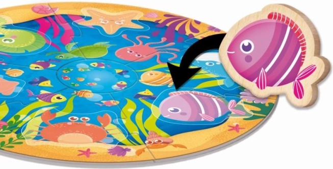 Rundes Holzpuzzle zur Entwicklung des Tastsinns und logischer Fähigkeiten. Perfekt für Kinder ab 1 Jahr.
