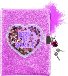 Tagebuch mit glitzerndem, hartem Einband. Enthält 160 farbige Seiten, einen Federstift und ein Schloss mit Schlüsseln. Geeignet ab 6 Jahren.