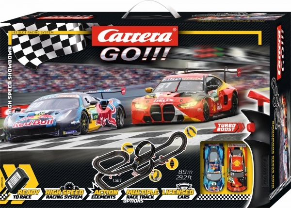 Erleben Sie spannende Rennen zu Hause mit der Carrera GO DTM High Speed Show Autorennbahn mit einer Länge von 8,9 m. Das Set bietet zwei Loopings, überhöhte Kurven, eine vertikale Wand und einen Rundenzähler. Enthalten sind detailreiche Fahrzeuge BMW M4 GT3 und Ferrari 488 GT3 mit DTM-Lizenz, Controller mit Turbo-Funktion und eine einfache Montage dank Klemmsystem.