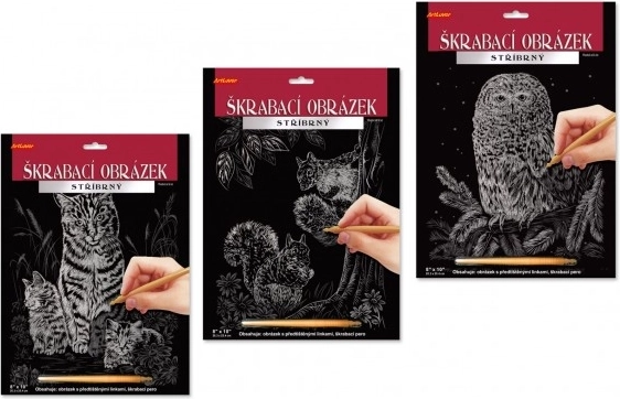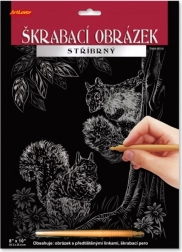 1× Bild mit silbernem Untergrund und schwarzer Schicht, 1× Kratzstift aus Kunststoff