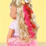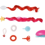 Lange blonde Haare können mit den beiliegenden Accessoires gestylt werden, einschließlich Spiralgummis und bunter Strähnen.