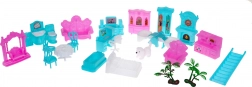 Das Puppenhaus enthält viele Möbel und Accessoires, einschließlich Kamin, Möbeln und Gartenelementen.