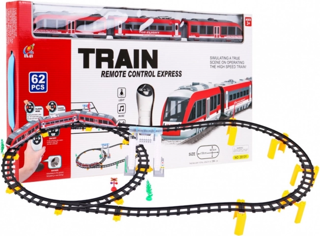 | | Das große Zugset mit Schienen ist für Kinder ab 3 Jahren bestimmt. Das Set besteht aus 62 Elementen, die Streckenlänge beträgt bis zu 396 cm. Der Zug wird mit einer Fernbedienung gesteuert und fährt im oder gegen den Uhrzeigersinn. Der Zug gibt Fahrgeräusche von sich und die vorderen oder hinteren Lichter leuchten je nach Fahrtrichtung. Das Spielzeug wird mit AA-Batterien betrieben – 2 x 1,5 V (Fernbedienung) und 3 x 1,5 V (Zug). | |