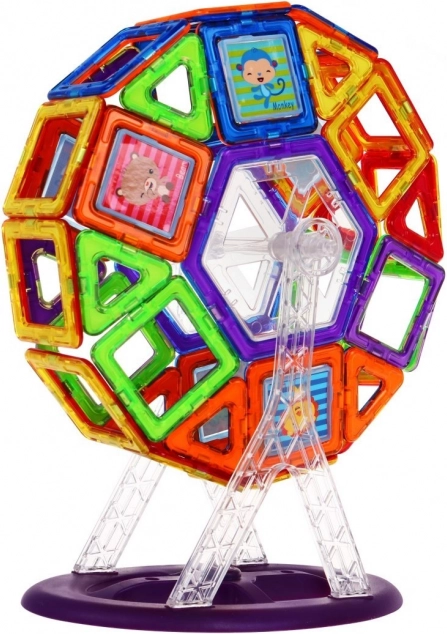 - 56 Stück bunte magnetische Bausteine in verschiedenen Formen (Rechtecke, Dreiecke, Trapeze, Quadrate usw.), - 42 Kunststoffblöcke – Einsätze (Quadrate), - Karussell-Basis, - 2 Seitenteile, die das Karussell stützen und seine Drehung ermöglichen, - 2 Achsen für Räder, - 4 Räder, - 3 Bögen mit bunten Aufklebern - Musterheft mit Beispielvorlagen für Karussellkonstruktionen und Autos, - ästhetische, farbenfrohe Verpackung, ideal als Geschenk | |