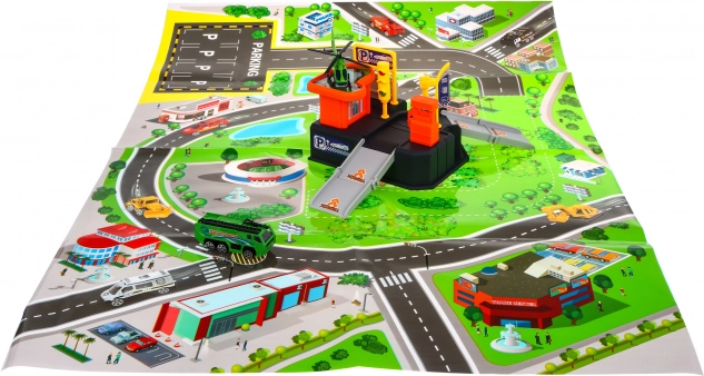Dieses bunte Kunststoff-Set verwandelt das Kinderzimmer in ein kleines Verkehrszentrum. Das zweigeschossige Parkhaus mit Rampen und Helipad wird durch eine übersichtliche Spielmatte mit Stadt und Straßen ergänzt, auf der Kinder mit dem Auto fahren und mit dem Hubschrauber landen können. Dank der kompakten Maße passt es leicht ins Zimmer und ist schnell aufgeräumt.