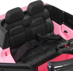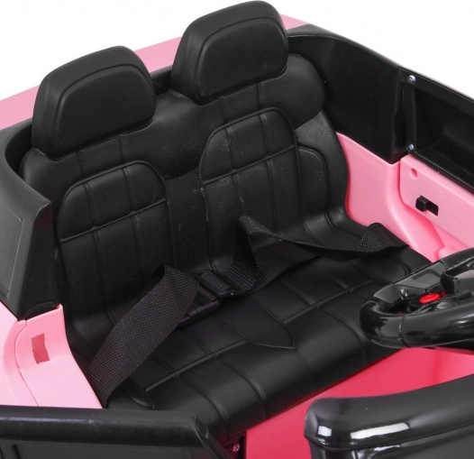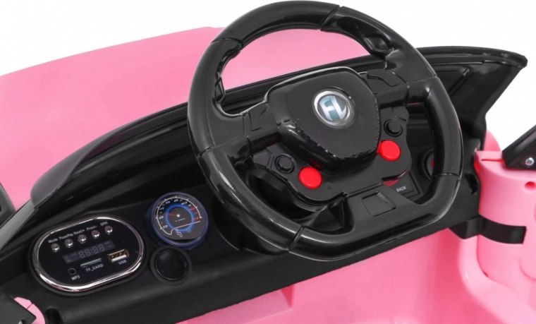 Eltern schätzen die 2,4-GHz-Fernbedienung mit drei Geschwindigkeiten und der Sicherheits-STOP-Taste. Für Komfort sorgen vier Stoßdämpfer (2× vorne, 2× hinten), Sicherheitsgurte und öffnende Türen mit Verriegelung. Das Audiopanel ermöglicht das Abspielen von USB, SD-Karte, über AUX sowie integrierte Melodien; eine Hupe am Lenkrad und eine Ladezustandsanzeige sind ebenfalls vorhanden.