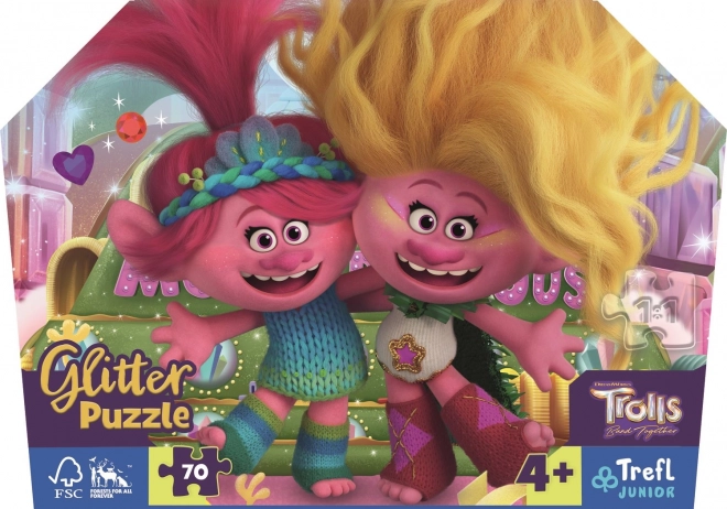 Wir stellen vor: Puzzle Glitzernde Trolle von der Marke Trefl Junior - 70 Teile mit feinem goldenen Glitzer, die Ihrem Spiel Glanz und Freude verleihen.