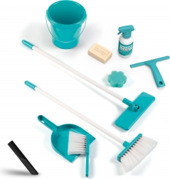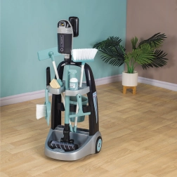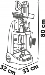 Zum Wagen gehören Besen, Mopp, Kehrschaufel, Handfeger, Eimer, Schwamm und Reinigungsmittel, die Kinder bei ihrer imaginären Reinigungsarbeit voll und ganz beschäftigen.