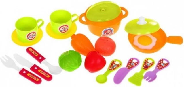 Aufklappbarer Koffer–Auto, Arbeitsplatte mit Imitation einer Induktionskochplatte, 2 seitliche Ablagefächer, Haken für Küchenwerkzeug, Topf mit Deckel, Pfanne mit Deckel, 2 Teller, 2 Becher, 2 Gabeln (klein und groß), 2 Löffel (klein und groß), 2 Messer (klein und groß), Pfannenwender, Wasserhahn, 4 Stück Gemüse/Obst (Paprika, Karotte, Kohl, Orange), Spiegelei, farbige Geschenkverpackung