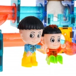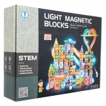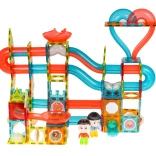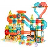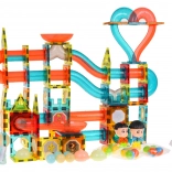 Magnetischer Baukasten für Kinder ab 3 Jahren. Enthält 202 Teile und ermöglicht den Bau einer Kugelbahn in beliebiger Anordnung. Einige Teile werden mit Batterien betrieben; nach dem Einschalten erleuchten pulsierende Lichter die Bahn und das Spiel macht noch mehr Spaß. Die Lichter blinken in 3 Modi: schnell, mittel und langsam – es kann der am besten geeignete für das Kind ausgewählt werden. Einige Kugeln blinken auch nach dem Schütteln. Das Set enthält außerdem farbige Kapseln mit Farbwechsel und zwei LED-Strahler. Stromversorgung: 18 × 1,5 V LR1130, 12 × 1,5 V LR41, 8 × 3 V CR1220 (Batterien sind im Lieferumfang enthalten).