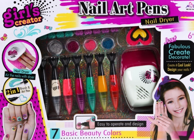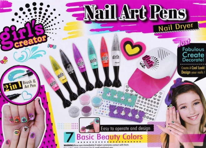 Enthält eine batteriebetriebene Nageltrockner, dekorative Steine, jede Menge Aufkleber und weitere Werkzeuge für Nagelkunst.