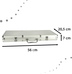 Das Set enthält auch Würfel, die Möglichkeiten für verschiedene Spielarten eröffnen, und Schlüssel für das sichere Verschließen des Transportkoffers. Die Eleganz und Haltbarkeit des Designs machen diesen Koffer zu einem geeigneten Mittel, um Spielkomponenten sicher zu transportieren und aufzubewahren.