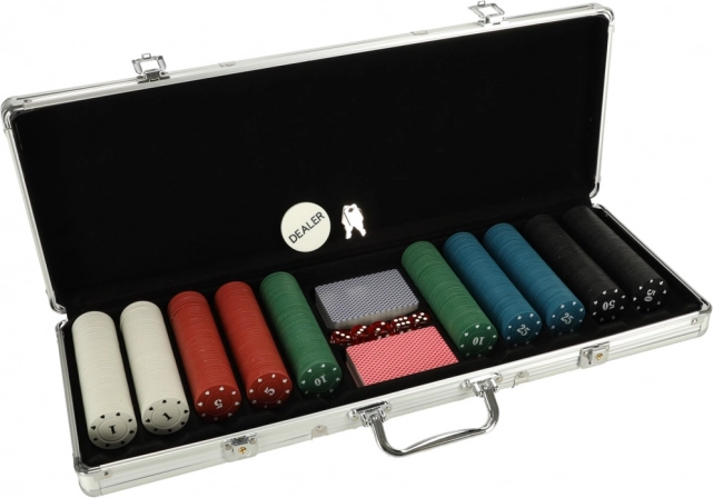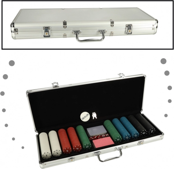 Das Set enthält Chips, Karten und Würfel für verschiedene Spielvarianten. Der silberne Koffer sorgt für eine sichere Aufbewahrung der Komponenten und einen einfachen Transport.