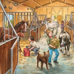Kinder setzen eine Pflegeszene, das Leben im Stall und einen fröhlichen Ausritt durch die Landschaft zusammen – jeweils 49 Teile in leuchtenden Farben.