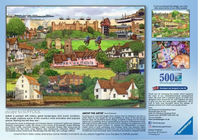 Entdecken Sie den Charme der englischen Landschaft mit dem Ravensburger Puzzle „Flucht nach Suffolk“. Das Set aus 500 präzise gestanzten Teilen bietet einen ausgewogenen Schwierigkeitsgrad für Einsteiger und Fortgeschrittene. Dank hochwertigem Druck und robustem Karton erwarten Sie lebendige Farben und ein sanftes Puzzelerlebnis ohne Ausfransen.