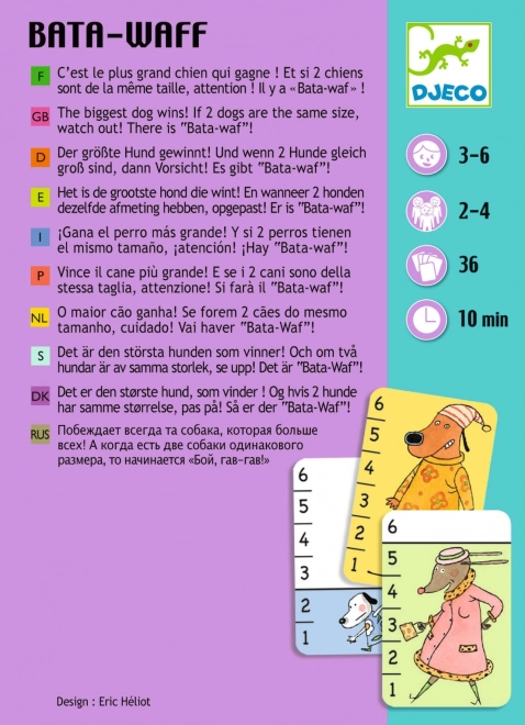 Das unterhaltsame Kartenspiel DJECO Bata-Waf für 2–4 Spieler basiert auf dem beliebten „Höher sticht“. Ideal für kleinere Kinder, die noch nicht zählen können – entscheidend ist der größere Hund auf der Karte. Ein schnelles Familienspiel mit einer Dauer von etwa 10 Minuten und einfachen Regeln.