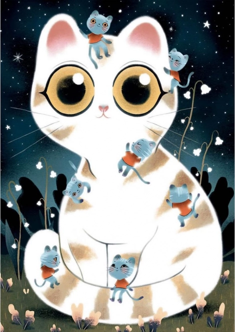 Fluoreszierendes (neonfarbenes) Puzzle mit dem Motiv kuscheliger Katzen, die im Dunkeln leuchten.