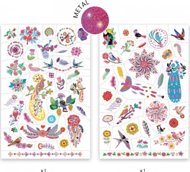 Entdecken Sie den Zauber farbenfroher, temporärer Tattoos mit glitzernden Vogelmotiven von DJECO. Kinder lieben die verspielten Illustrationen und den feinen Glitzer, der auf der Haut zur Geltung kommt. Die Tattoos lassen sich einfach mit Wasser auftragen, trocknen schnell und halten lange.