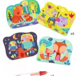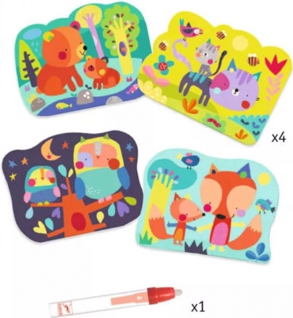Die Wasser-Malbücher von DJECO bieten Kindern ab 18 Monaten einfaches und sauberes Gestalten ganz ohne Malkästen. Auf vier stabilen Karten im Format 21 × 26 cm erscheinen beim Kontakt mit Wasser niedliche Figuren – ein Bärchen, ein Kätzchen, ein Eulchen und ein Fuchs. Sobald das Wasser getrocknet ist, verschwindet das Bild und das Spiel kann von vorn beginnen.
