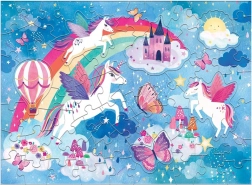 Die farbenfrohe Illustration mit Einhörnern, Regenbogen und Schmetterlingen lädt zum Puzzeln ein und fördert Vorstellungskraft und Geduld.