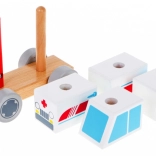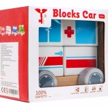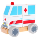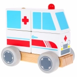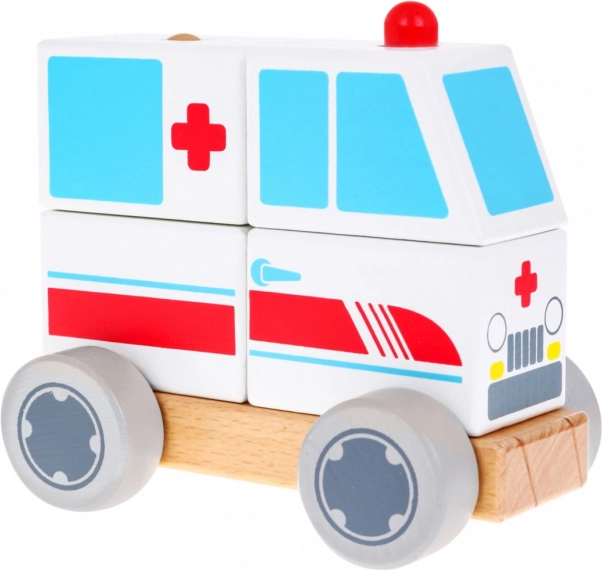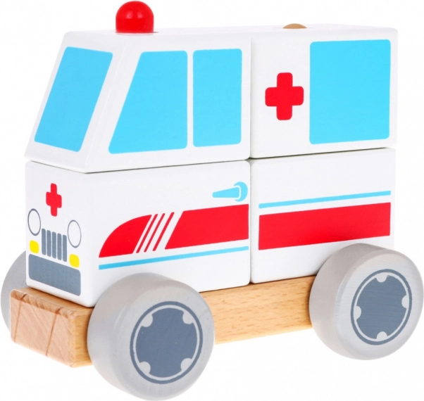 Dieser hölzerne Krankenwagen ist ideal für erste Bau- und Motorikspiele. Kinder stecken vier Klötze auf zwei Stifte in der Basis und bauen ihr eigenes Fahrzeug mit vertrauten Symbolen des Rettungsdienstes. Federnde Räder sorgen für eine geschmeidige Fahrt auf dem Boden und fördern Vorstellungskraft sowie thematisches Rollenspiel als Retter.