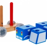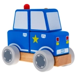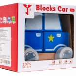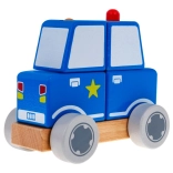Vier Holzklötze werden auf zwei Stifte gesteckt und bilden gemeinsam ein realistisches kleines Polizeiauto. Ideal für erste logische Aufgaben.