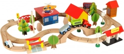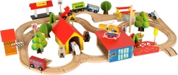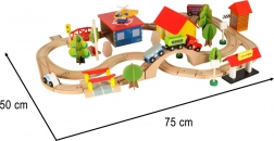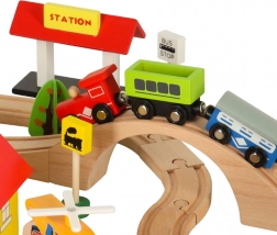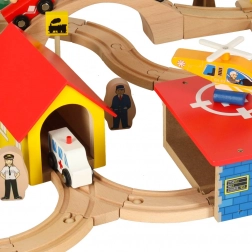 Entdecken Sie unbegrenzte Möglichkeiten mit diesem bunten Holzschienenset. Das Set enthält einen Bahnhof, Brücken, eine Hubschrauberlandeplattte, Figuren und weitere Teile, die es ermöglichen, eine eigene kleine Stadt zu bauen.