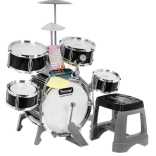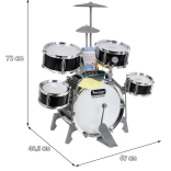 Das multifunktionale Kinder-Schlagzeugset enthält 5 Trommeln, 2 elektronische Becken (aus Kunststoff) und ein Metallbecken, Bedienfeld, Mikrofon, 2 Sticks und 6 Notenkarten für die einfache Erlernung des Spiels. Das Set wird durch drei AA-Batterien oder ein USB-Kabel betrieben.