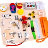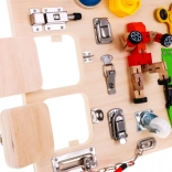 Die Tafel enthält eine Vielzahl interaktiver Elemente wie Schlösser, Schalter und Rückstellmechanismen, die die Verbesserung der Feinmotorik und das Lernen von kausalen Beziehungen unterstützen.