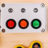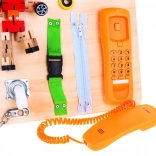 Die hölzerne multifunktionale Tafel ist so gestaltet, dass sie Kindern sensorische und manipulative Erlebnisse bietet. Sie enthält Elemente, die ein Kind im Alltag sieht und hilft zu verstehen, wie sie funktionieren. Sie beinhaltet Geräusch- (Glocke) und Lichtelemente (Schalter mit Diode), was ihren interaktiven Wert erhöht. Die Tafel wird mit 2 AA-Batterien betrieben, die nicht im Lieferumfang enthalten sind.