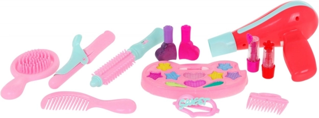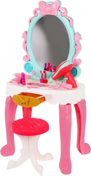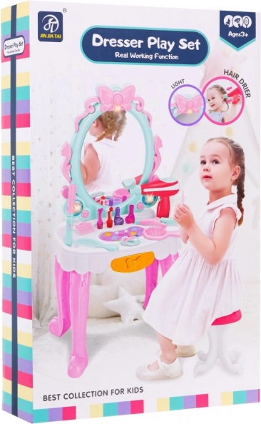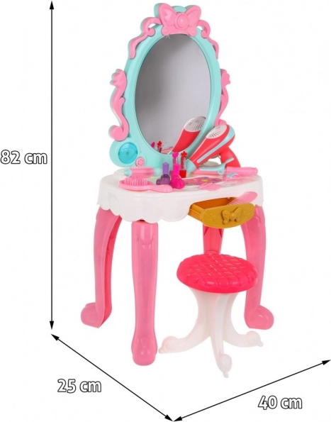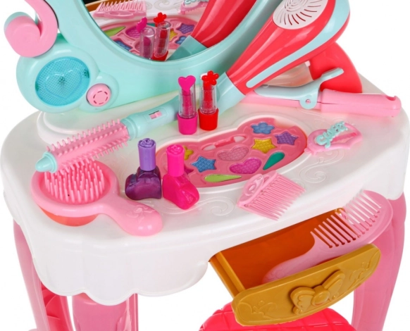 | Lieferumfang | - Schminktisch mit Spiegel, - Hocker, - 10 x Lidschatten, - Lidschattenpinsel, - Haartrockner, - Kamm, - Bürste, - Haarglätter, - Lockenstab, - 2 x Haarklammer, - 2 x Lippenstift, - 2 x Haarspray. |