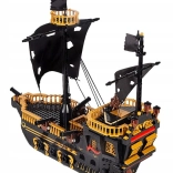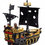 Das Schiff ist mit detaillierten Elementen gefertigt, die an ein echtes Piratenschiff erinnern, einschließlich schwarzer Segel und goldener Verzierungen.