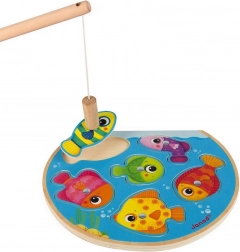 Ein unterhaltsames magnetisches Steckpuzzle aus Holz für kleine Angler. Mit der magnetischen Angelrute fangen Kinder die Teile und legen sie an die richtige Stelle zurück. Enthält 6 bunte Fische und 1 Angelrute, fördert die Feinmotorik, die Hand–Auge–Koordination sowie das Erkennen von Farben und Formen. Geeignet ab 12 Monaten.
