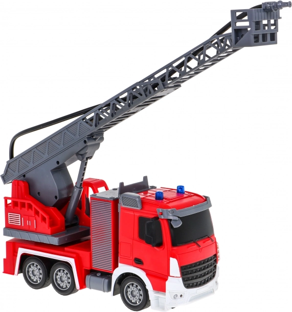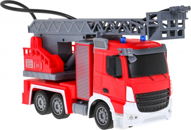 Großes interaktives Feuerwehrauto mit beweglicher und drehbarer Leiter, Wasserschlauch und vielen Funktionen, geeignet für Kinder ab drei Jahren. Das Fahrzeug wird mit einer 2,4-GHz-Fernsteuerung bedient. Es fährt vorwärts und rückwärts und lenkt nach rechts und links. Es hat Gummireifen und gummierte Spiegel. Das Spielzeug verfügt über eine Soundfunktion – Geräusche beim Anheben und Ausfahren der Feuerwehrleiter – sowie eine Lichtfunktion – Frontscheinwerfer und blinkende Lichter auf der Oberseite des Fahrzeugs beim Anheben und Absenken des Krans. Die Feuerwehrleiter kann ausgefahren, nach oben und unten bewegt und um 180 Grad gedreht werden. Das Fahrzeug ist mit einem Wasserschlauch ausgestattet, aus dem Wasser spritzt! Das Spielzeug wird von einem 500 mAh 3,7 V Akku (im Lieferumfang enthalten) betrieben, die Fernsteuerung von 2 x AA 1,5 V Batterien (nicht enthalten).