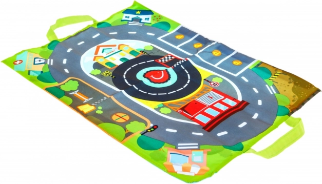 Die Matte mit Straßen, Häusern und Natur lässt sich dank Klettverschlüssen zu einer praktischen Tragetasche mit Griffen zusammenfalten. Einfach zu verstauen und überallhin mitzunehmen.