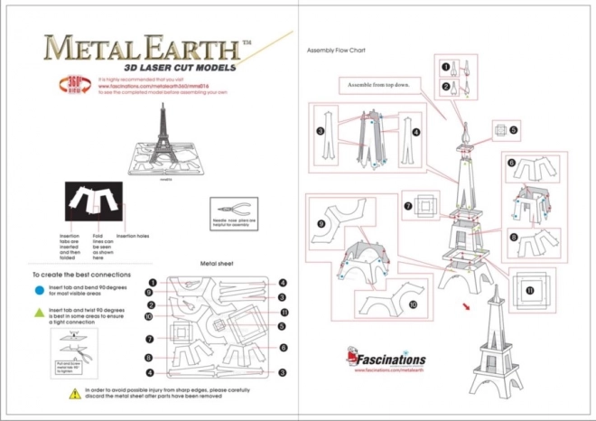 Entnehmen Sie die einzelnen Teile aus den Metallplatten; bei Bedarf verwenden Sie kleine Seitenschneider (nicht enthalten). Die Teile werden mittels Schlössern verbunden, die aus einem Haken (Nase) und einer Öffnung bestehen. Biegen Sie die Nase mit einer kleinen, feinen Zange (nicht enthalten) um und verbinden Sie nach und nach alle Schlösser, bis ein sehr realistisches Meisterstück entsteht!