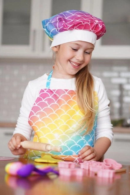 Ein auffälliges Muster in Regenbogenfarben verleiht jedem Backen das gewisse Etwas. Die stylische Schürze mit Tasche und die passende Kochmütze schützen die Kleidung und sehen zugleich großartig aus.