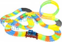 Die im Dunkeln leuchtende Strecke mit Looping und Auto im Set ist bereits für Kinder ab 3 Jahren geeignet. Die Schienen sind flexibel und können in beliebigen Kombinationen angeordnet, gedreht, angehoben und während der Fahrt des Autos umgebaut werden. Zudem sind die Schienen fluoreszierend und leuchten im Dunkeln. Das im Set enthaltene Fahrzeug verfügt über eine LED-Beleuchtung; die Fahrt im Dunkeln erzeugt einen tollen Effekt. Das Fahrzeug wird mit 2 AA-Batterien 1,5 V betrieben, Batterien sind nicht im Lieferumfang enthalten. Um das Auto zu starten, drücken Sie einfach die Taste auf dem Dach. Die Gesamtlänge der Strecke beträgt 446 cm. . |
