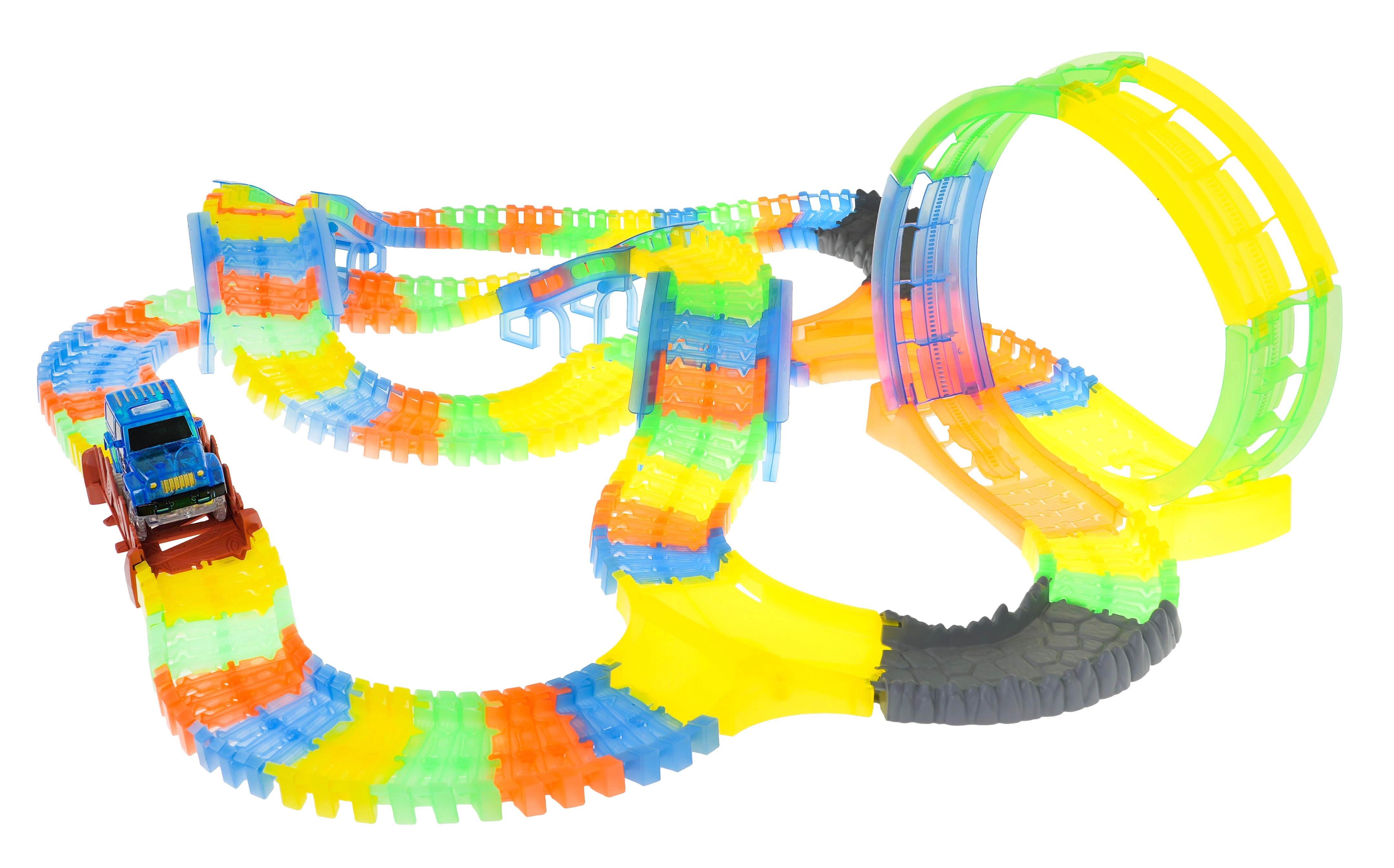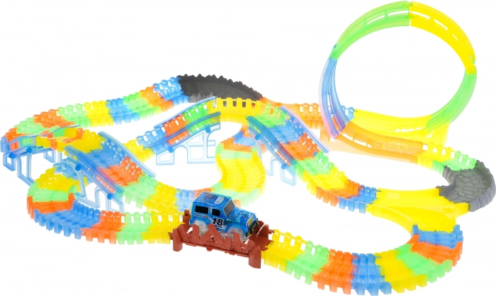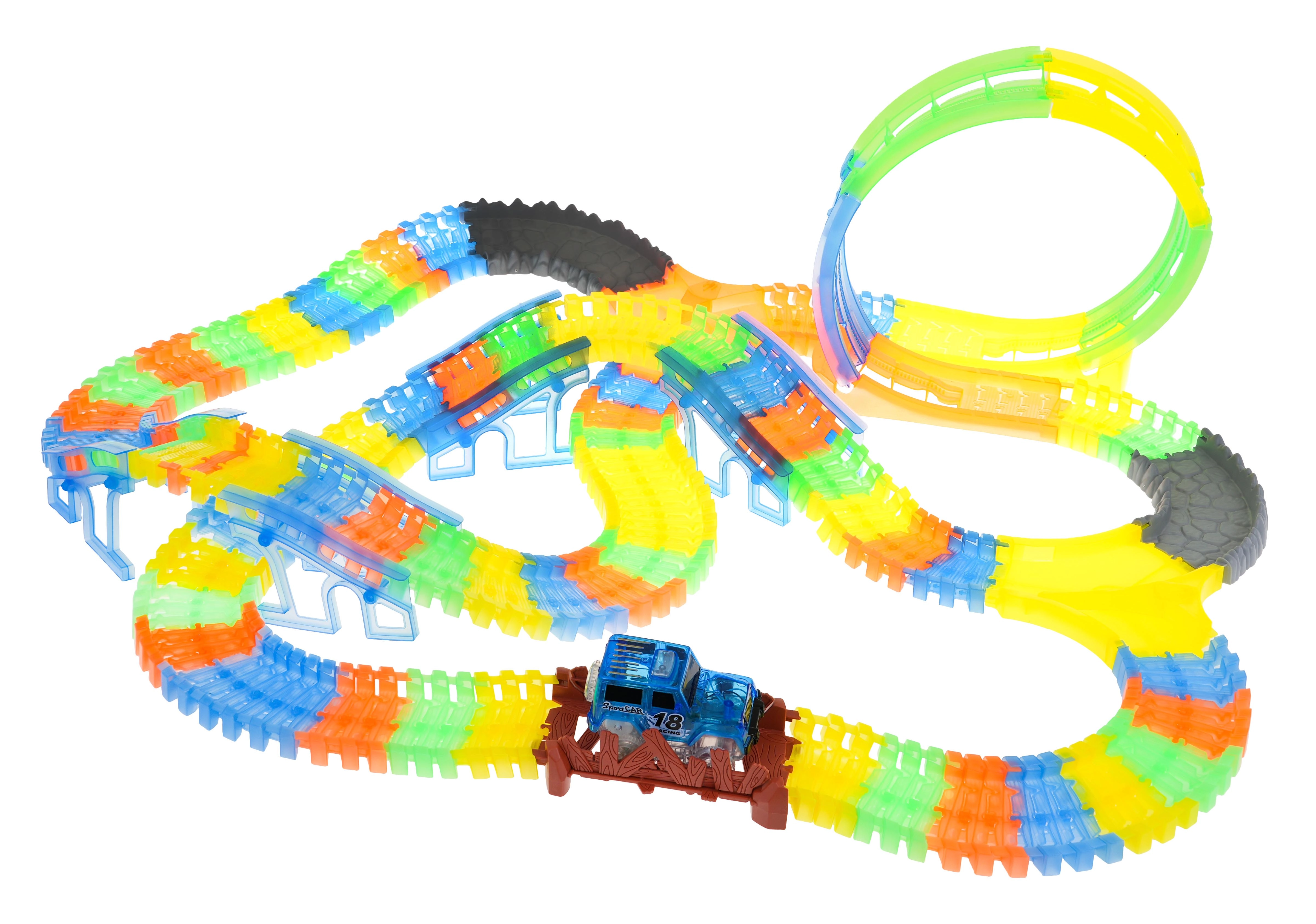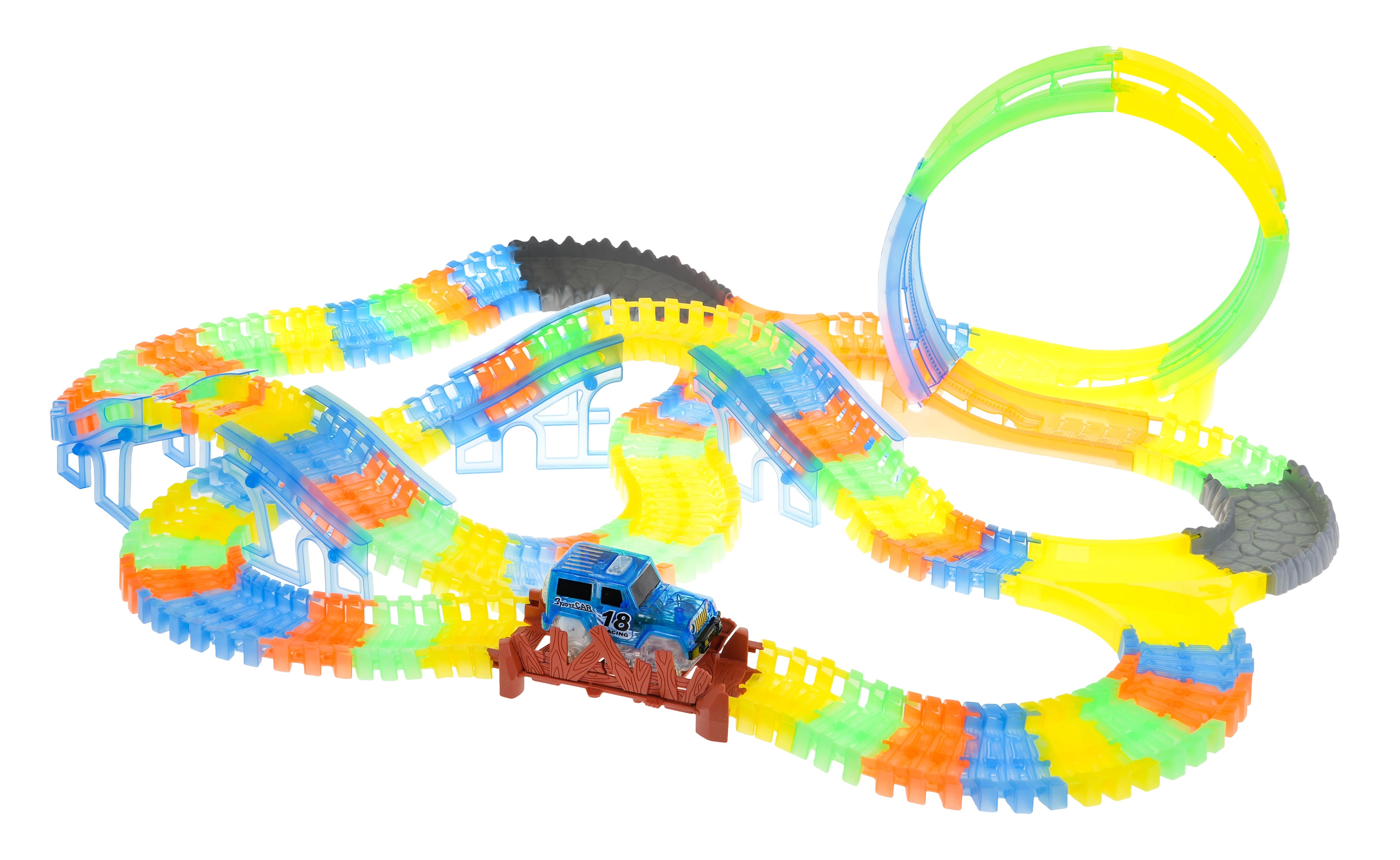Die im Dunkeln leuchtende Strecke mit Looping und Auto im Set ist bereits für Kinder ab 3 Jahren geeignet. Die Schienen sind flexibel und können in beliebigen Kombinationen angeordnet, gedreht, angehoben und während der Fahrt des Autos umgebaut werden. Zudem sind die Schienen fluoreszierend und leuchten im Dunkeln. Das im Set enthaltene Fahrzeug verfügt über eine LED-Beleuchtung; die Fahrt im Dunkeln erzeugt einen tollen Effekt. Das Fahrzeug wird mit 2 AA-Batterien 1,5 V betrieben, Batterien sind nicht im Lieferumfang enthalten. Um das Auto zu starten, drücken Sie einfach die Taste auf dem Dach. Die Gesamtlänge der Strecke beträgt 446 cm.