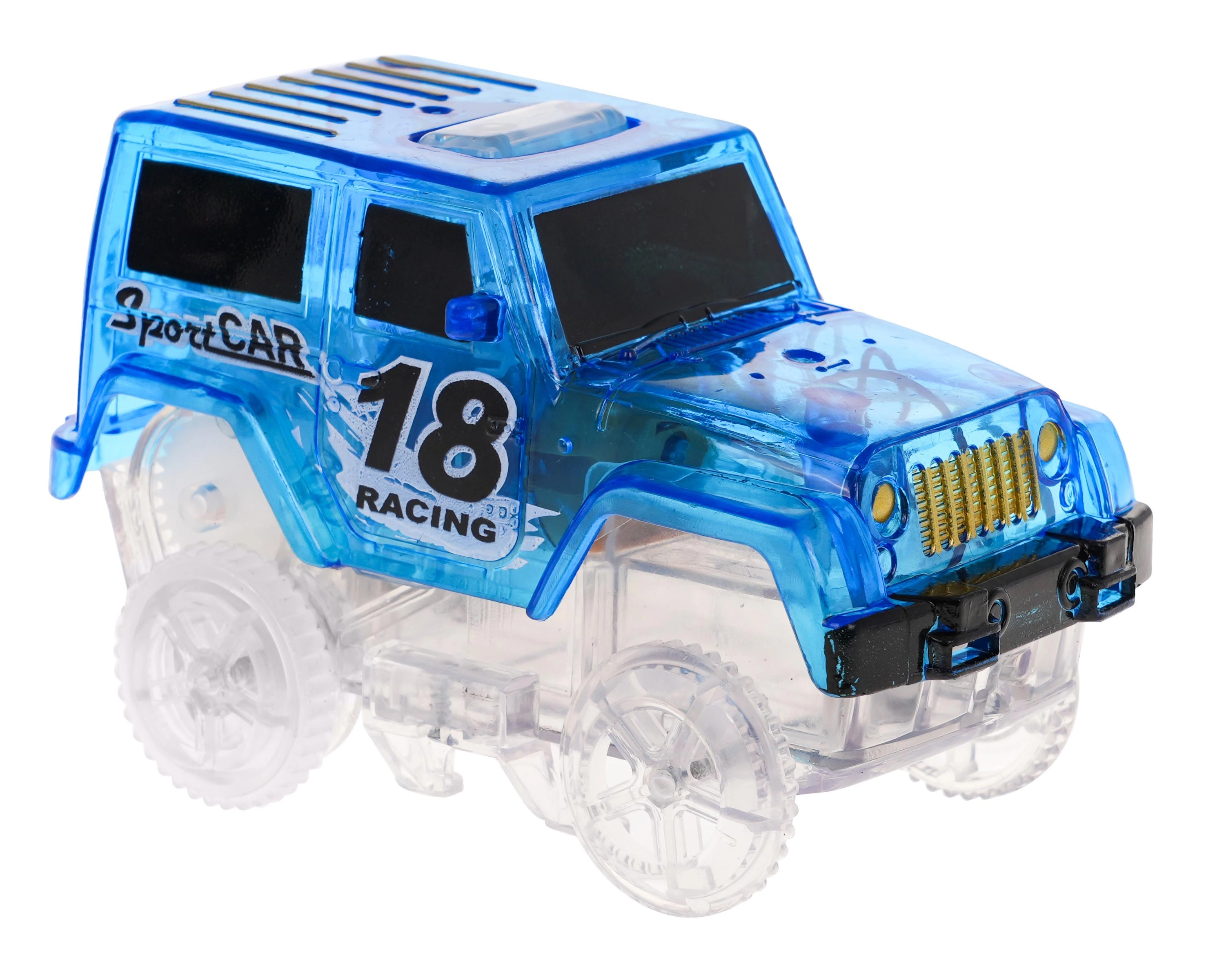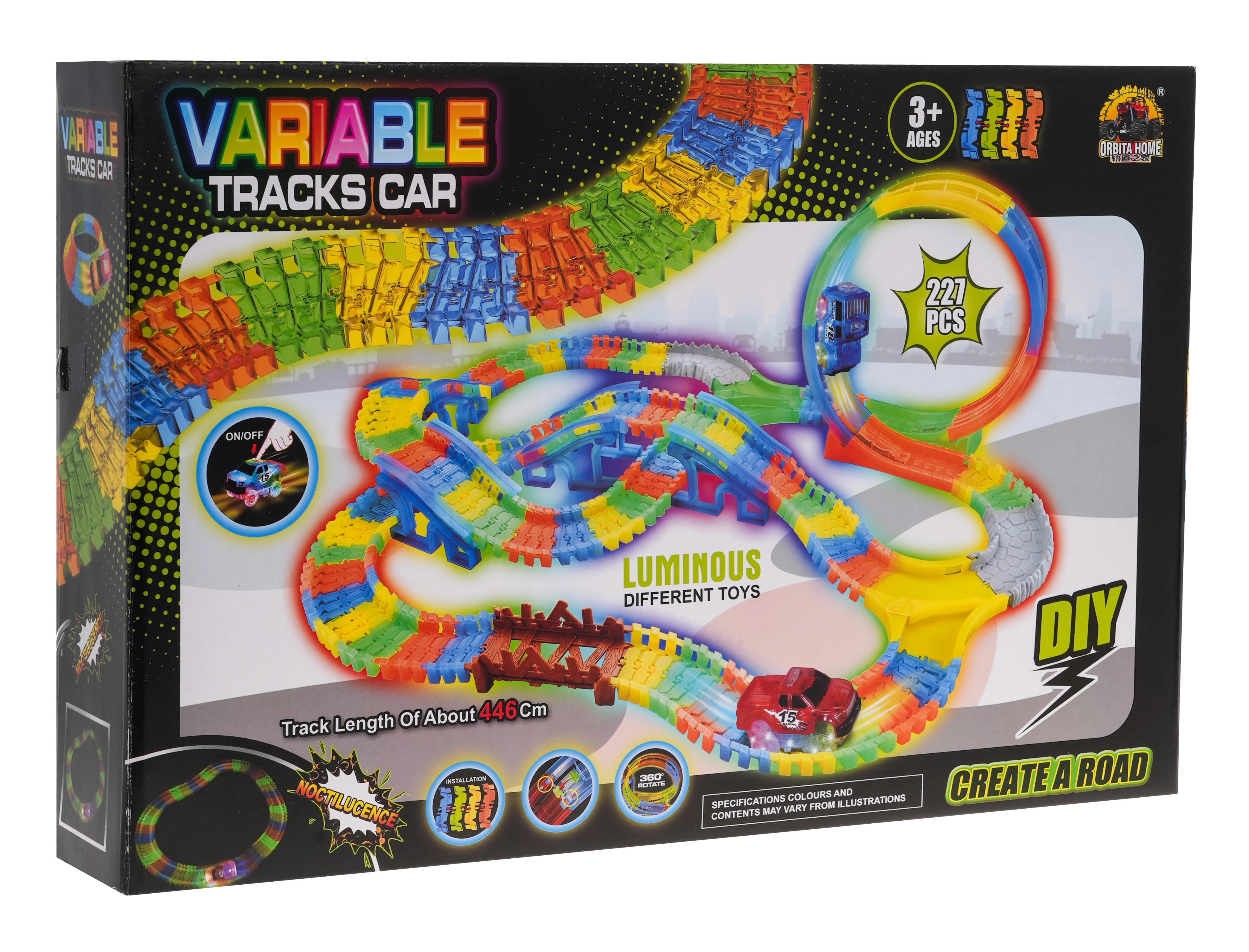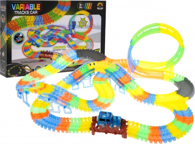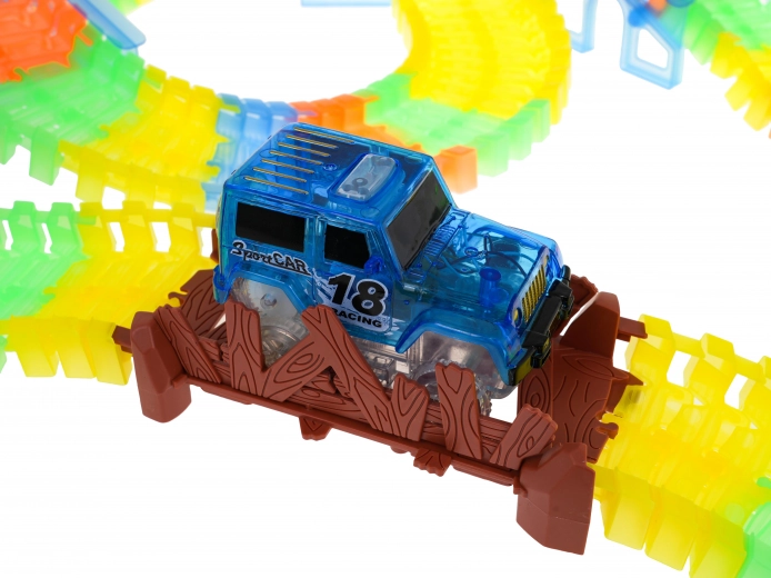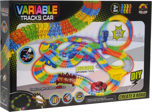 Die im Dunkeln leuchtende Strecke mit Looping und Auto im Set ist bereits für Kinder ab 3 Jahren geeignet. Die Schienen sind flexibel und können in beliebigen Kombinationen angeordnet, gedreht, angehoben und während der Fahrt des Autos umgebaut werden. Zudem sind die Schienen fluoreszierend und leuchten im Dunkeln. Das im Set enthaltene Fahrzeug verfügt über eine LED-Beleuchtung; die Fahrt im Dunkeln erzeugt einen tollen Effekt. Das Fahrzeug wird mit 2 AA-Batterien 1,5 V betrieben, Batterien sind nicht im Lieferumfang enthalten. Um das Auto zu starten, drücken Sie einfach die Taste auf dem Dach. Die Gesamtlänge der Strecke beträgt 446 cm.