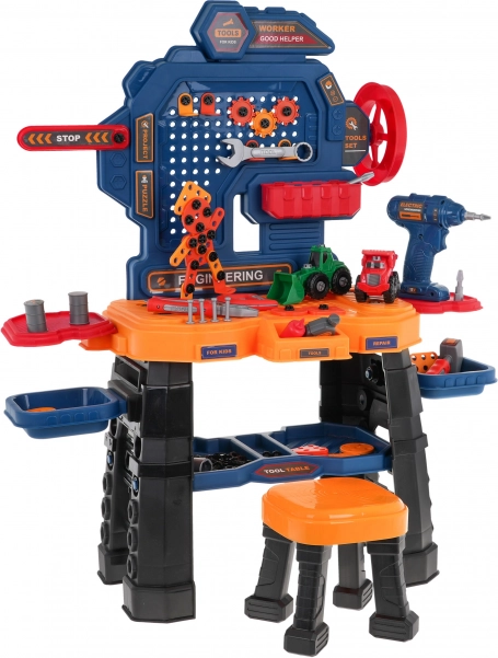 Dieses farbenfrohe Werkstattset verwandelt das Kinderzimmer in eine echte Mini-Werkstatt. Die robuste Werkbank mit Ablagen und Organizer wird durch einen bequemen Hocker und eine batteriebetriebene Akku-Bohrmaschine (2× AA, nicht enthalten) ergänzt. Kinder können schrauben, bohren und eigene Projekte bauen, einschließlich zwei Baufahrzeugen – Radlader und Kipper.
