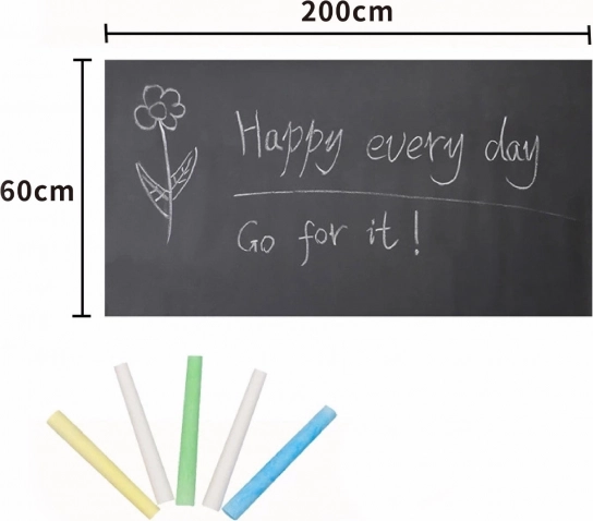 Die selbstklebende schwarze Tafel schafft auf glatten Flächen – Schrank, Tür, Wand oder Möbel – eine sofort nutzbare Schreibfläche. Dank der Größe von 200 × 60 cm bietet sie genügend Platz für Kinderzeichnungen, Familiennachrichten und Arbeitsnotizen. Die Oberfläche ist für klassische Kreiden ausgelegt und lässt sich leicht reinigen.
