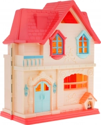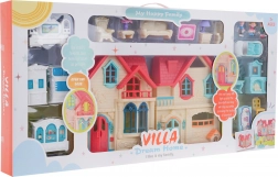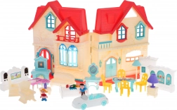 Im Set enthalten sind Möbel für Wohnzimmer, Küche und Schlafzimmer, ein Auto mit beweglichen Rädern sowie Figuren von Mama, Papa und Kind. Dekorative Aufkleber sind ebenfalls dabei.