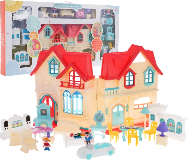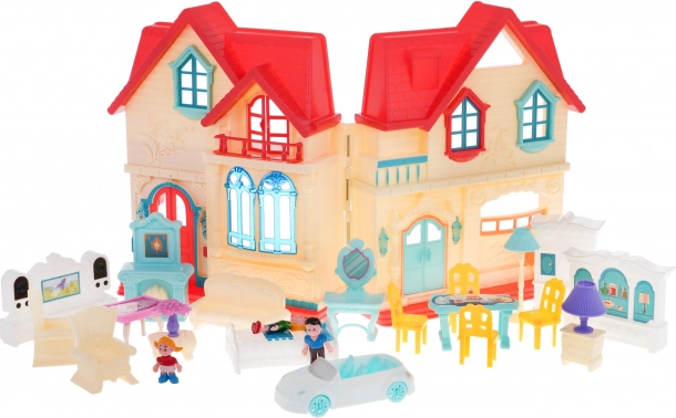 Zum Lieferumfang gehört ein umfangreiches Zubehörset: Möbel für Wohnzimmer, Schlafzimmer und Küche, Dekorationen, ein Auto mit beweglichen Rädern und drei Figuren (Mama, Papa, Kind). Dank des einfachen Aufklappens und der öffnenden Türen ist das Spielen übersichtlich und bequem.