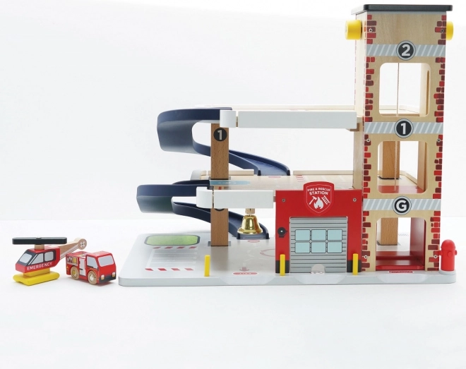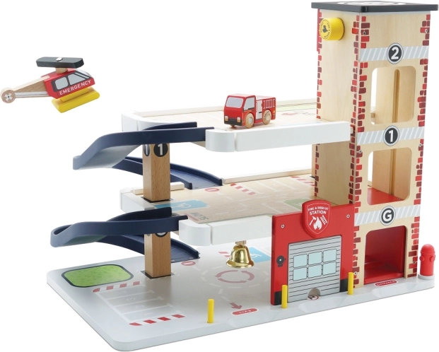 Entdecken Sie die Feuerwehrstation für Kinder, hergestellt aus hochwertigem Holz und entworfen für realistisches und inspirierendes Spielen. Enthält ein Feuerwehrauto, einen Hubschrauber und weitere durchdachte Details.