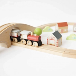 Diese Eisenbahnstrecke ist ein perfektes Werkzeug zur Förderung des fantasievollen Spiels bei kleinen Kindern. Sie ist aus hochwertigem Holz mit FSC-Zertifizierung gefertigt, was gewährleistet, dass sie umweltfreundlich ist. Das Set umfasst: