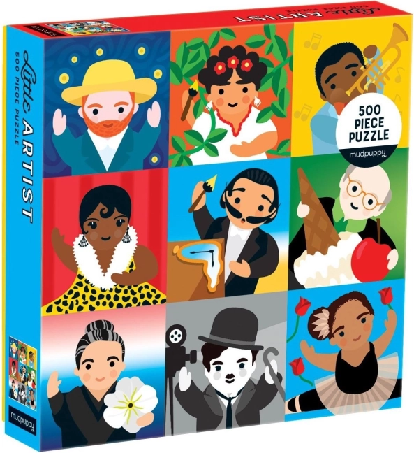 Familienpuzzle Kleiner Künstler von der Marke Mudpuppy ist ideal für Kunstliebhaber. Es enthält 500 Teile mit Illustrationen bekannter Persönlichkeiten, die verschiedene Kunstrichtungen beeinflusst haben.